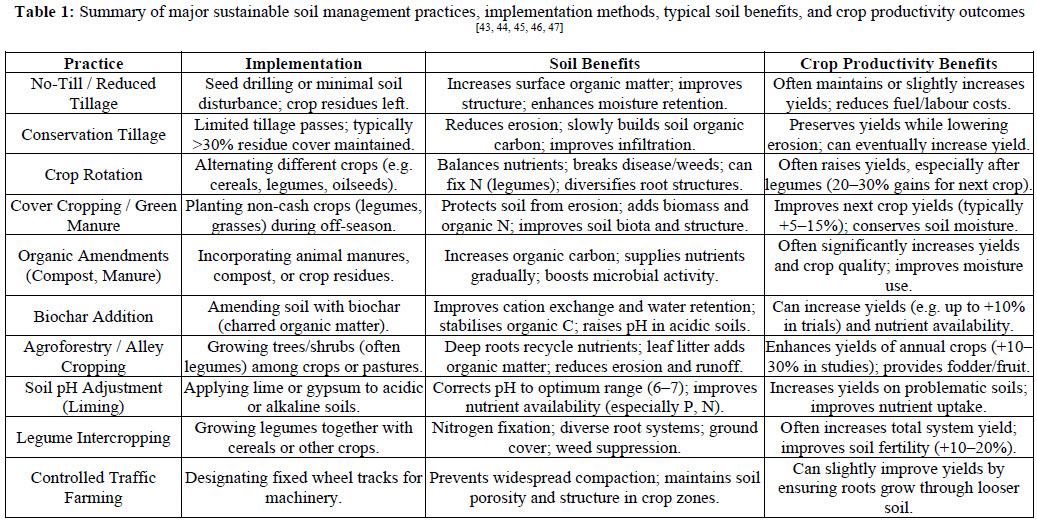 For the long-term health of the ecosystem and agricultural output, it is very important to manage soil in a way that is sustainable. As the world’s demand for food grows and soils get worse, strategies including low or no tillage, cover cropping, crop rotation, organic additions, and agroforestry have become quite popular. The goal of these methods is to add organic matter to the soil, make it stronger, and stop erosion. This article talks about the history of soil science and some of the most important people who helped it grow. Then it looks at the most important current ways of managing soil and how they affect the health of the soil and the amount of crops that grow. Several regional case studies demonstrate that the adoption of these practices specifically in sub-Saharan Africa, India, and North America has resulted in quantifiable enhancements in production. Data tables show standard procedures, how crops respond, and soil indicators. In general, integrated techniques that use more than one method tend to give the best results in terms of yield and soil fertility. When done correctly, sustainable soil management may increase agricultural yields by different amounts (sometimes tens of percent), make crops more resistant to changes in the weather, and lessen the need for chemicals from outside sources.